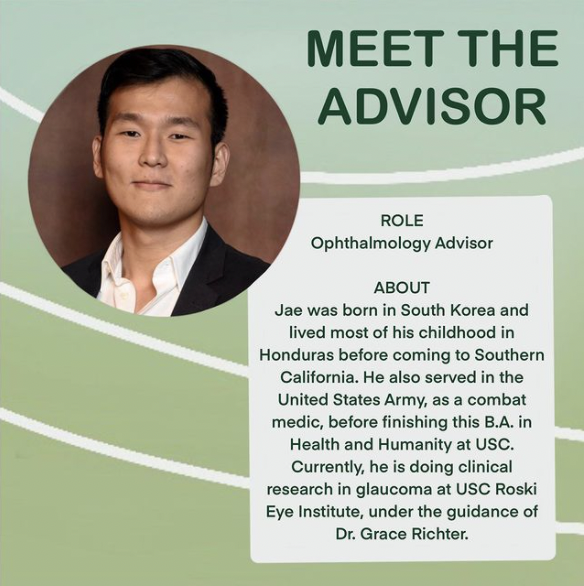 Jae was born in South Korea and lived most of his childhood in Honduras before coming to Southern California. He also served in the United States Army, as a combat medic, before finishing this B.A. in Health and Humanity at USC. Currently, he is doing clinical research in glaucoma at USC Roski Eye Institute, under the guidance of Dr. Grace Richter.